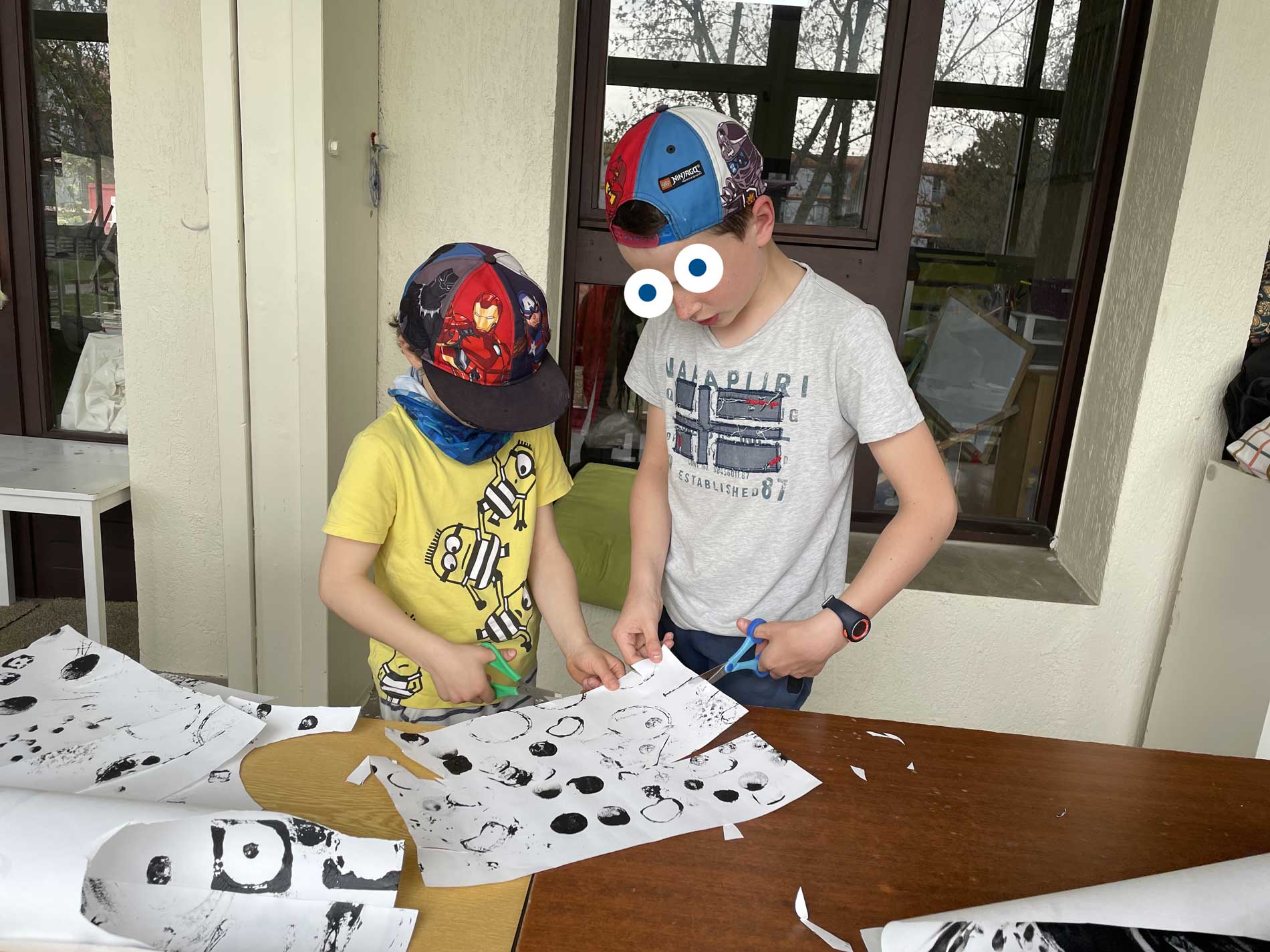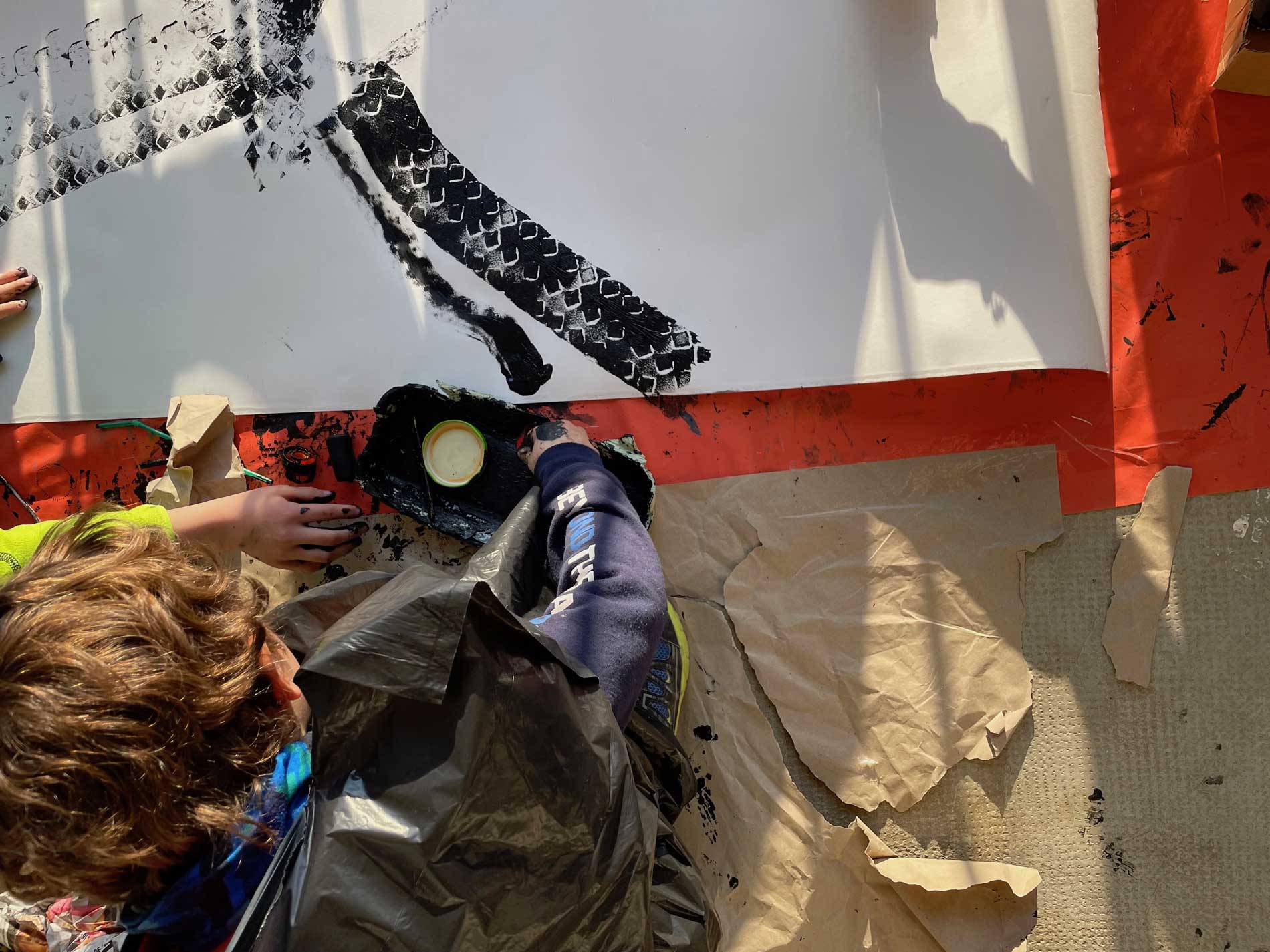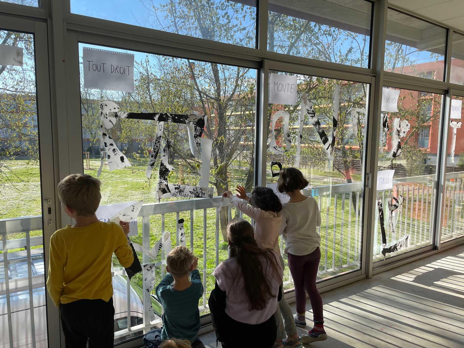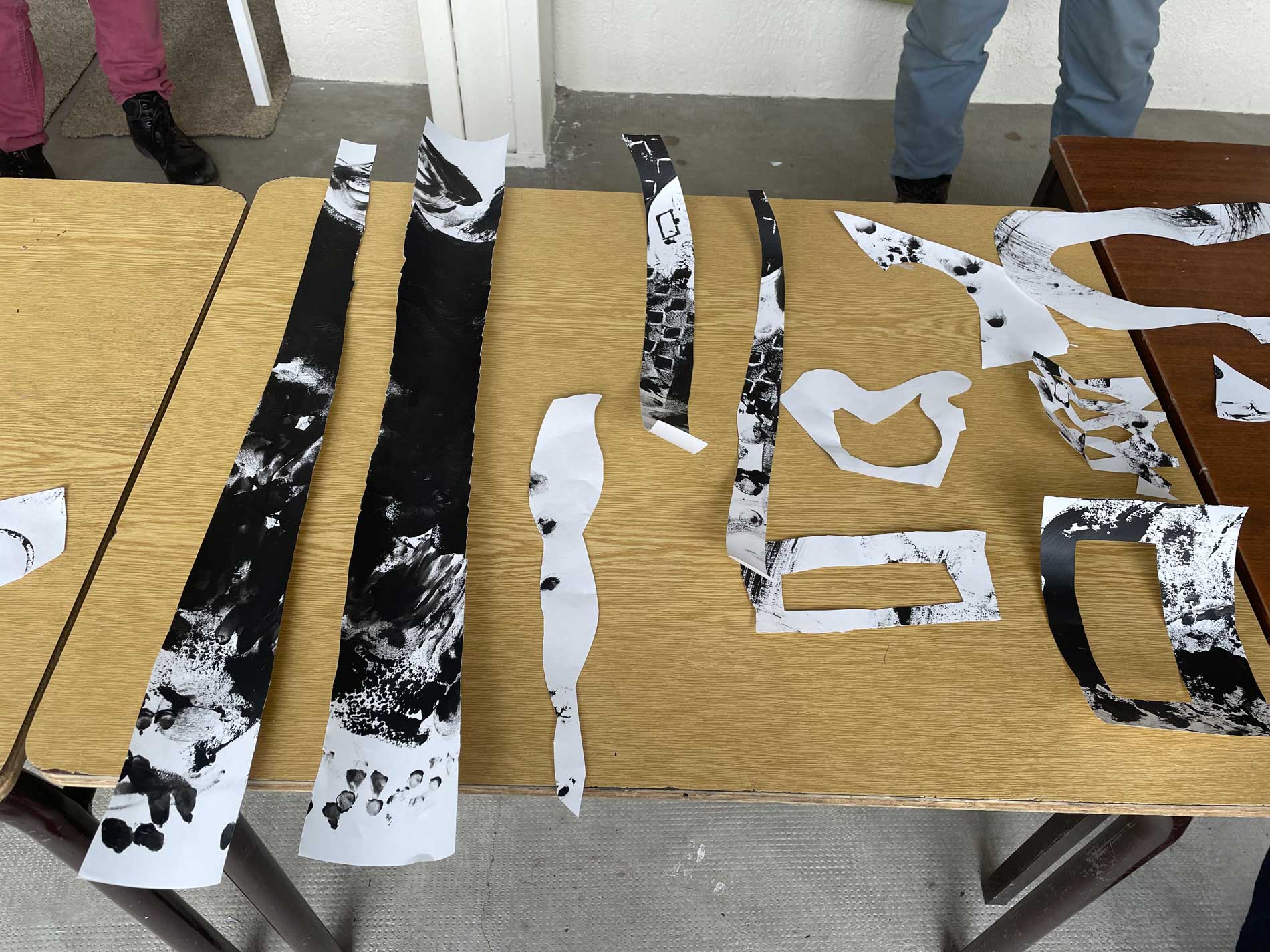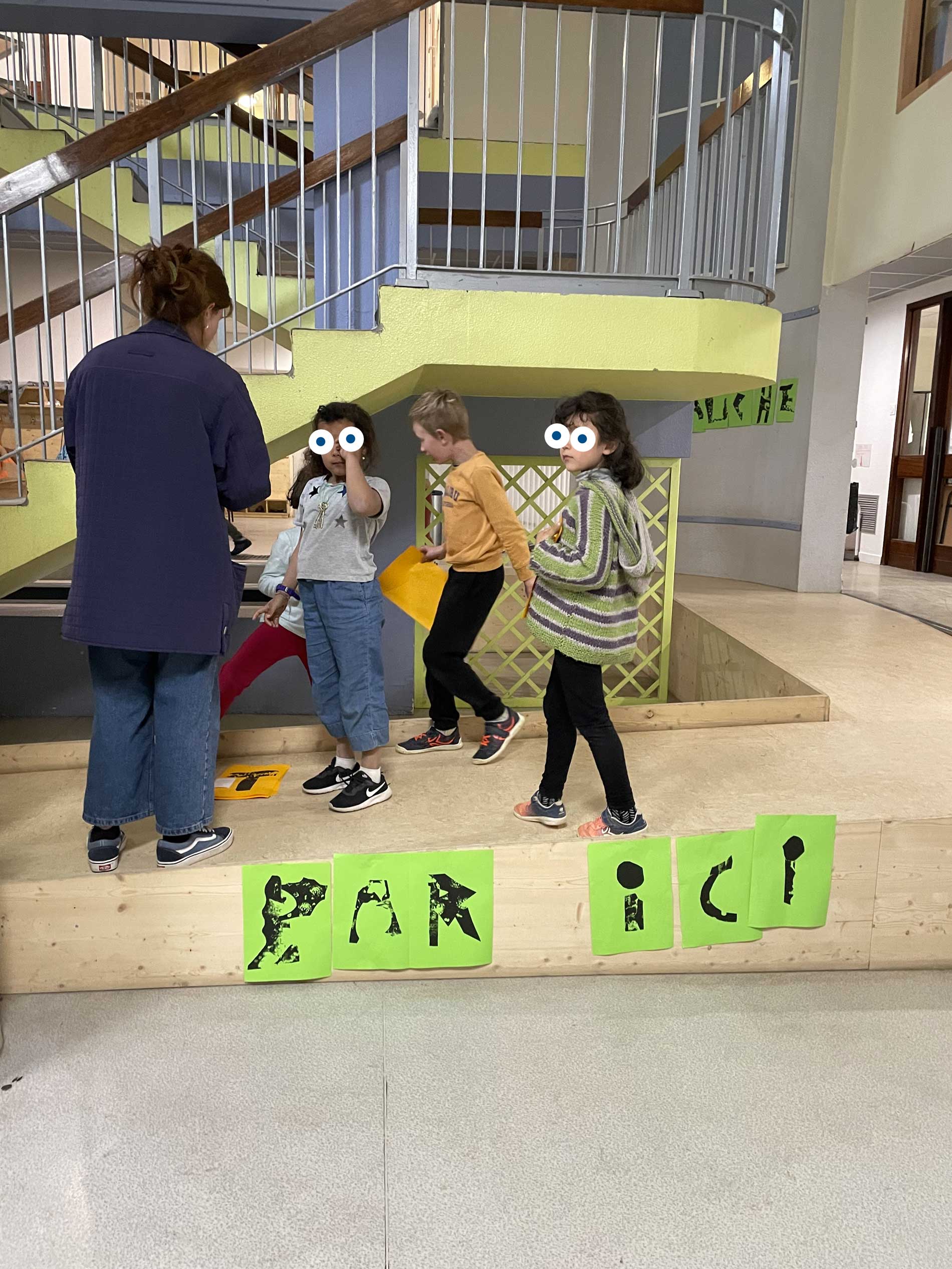 Atelier réalisé avec Léana Orsoni et Lorene Tissier. Dans la même perspective que les Ateliers à l’ÉSAD, nous avons voulu sensibiliser les enfants au travail de la lettre, avec cette fois-ci la notion d’espace. Le but de cet atelier était d'élaborer la signalétique d’une chasse au trésor et en créant les mots de direction de A à Z. Divisé en cinq séances, nous avons d’abord réaliser des trames en peinture avec des outils divers (mais surtout pas de pinceaux!) avant de découper des modules à partir de jeux/contraintes (formes piquantes, formes serpentueuses…) et les rassembler pour en faire des lettres en papier. Nous avons ensuite récupéré ces lettres pour les imprimer sur des A4 colorés pour deux différents parcours. La dernière séance à été dédiée à la mise en place des parcours et la chasse aux trésors : des petites cartes postales imprimées en riso, avec les lettres des enfants (et des bonbons).